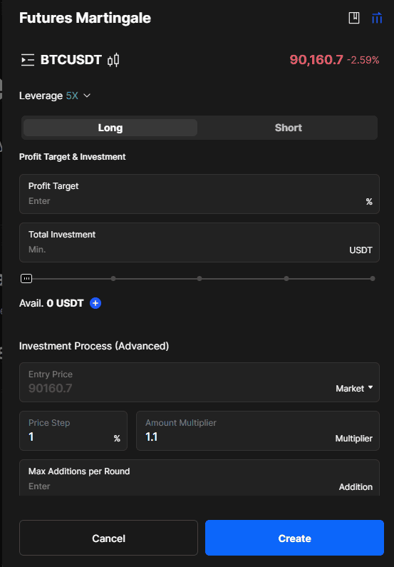 مارتينجال العقود الآجلة من BingX هي نسخة متقدمة من استراتيجية متوسط التكلفة بالدولار (DCA) مصممة للمتداولين الذين يرغبون في تسريع متوسط تكلفتهم خلال الانتكاسات. فبدلاً من استثمار مبلغ ثابت في أوقات ثابتة، يضيف النظام مراكز جديدة تلقائيًا عندما يتحرك السوق ضدك.