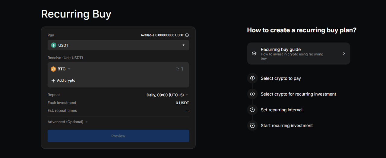 الشراء المتكرر، والذي يتيح لك استثمار مبالغ ثابتة وفق جدول زمني دون الحاجة إلى مراقبة السوق.