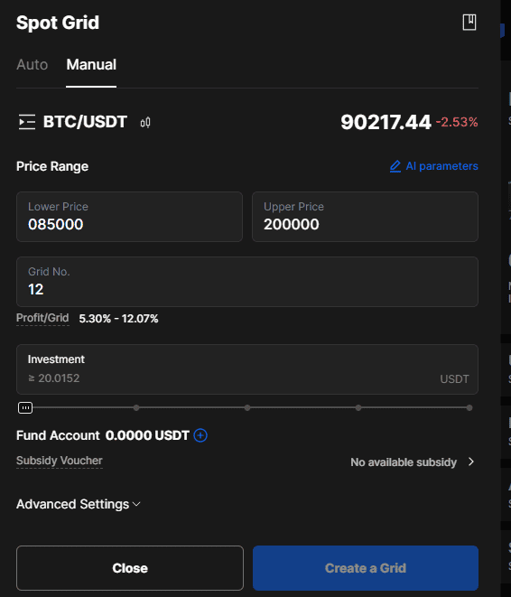 أدخل مبلغ استثمارك وقم بتفعيل الاستراتيجية. سيبدأ البوت في شراء كميات أكبر مع تحرك السعر نحو مستويات الشبكة الأدنى، مما يساعد على تقليل متوسط تكلفتك بمرور الوقت. على سبيل المثال، إذا وضعت 300 دولار أمريكي عبر 10 شبكات، سيشتري البوت المزيد من البيتكوين عند 92,000 دولار أمريكي، والمزيد عند 90,000 دولار أمريكي، وحتى المزيد عند 88,000 دولار أمريكي. وهذا يخلق تأثير متوسط طبيعي مشابه لاستراتيجية متوسط التكلفة بالدولار (DCA).