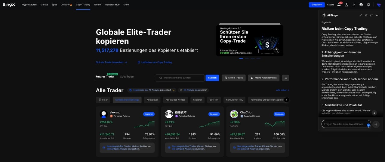 Die AI-Tools von BingX unterstützen dich bei der Auswahl passender Trader. Mit integrierter Analytik und automatisierter Ausführung wird die Teilnahme am Kryptomarkt einfacher.