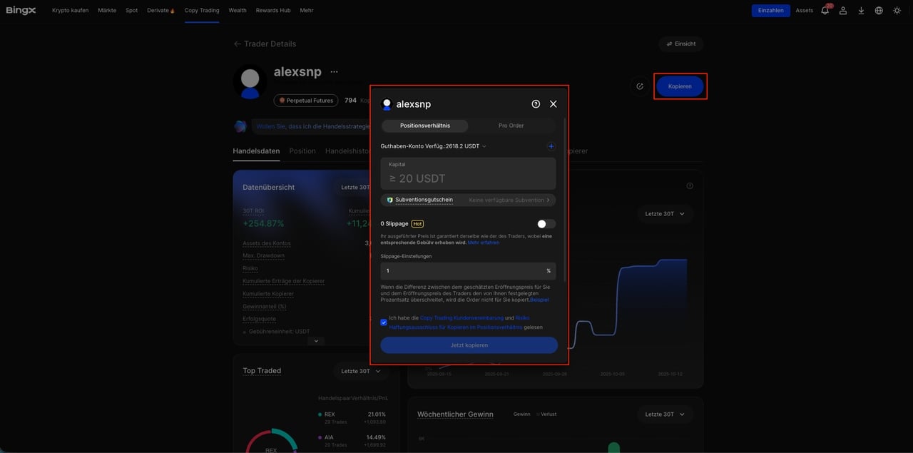 Copy Trading 2.0 ist die aktualisierte Social-Trading-Version von BingX mit mehr Transparenz, Kontrolle und Risikomanagement. Für jeden Kopierer gibt es ein eigenes Unterkonto. Du siehst Gewinne, Liquidationspreise und Hebel klarer, weist Mittel smarter zu und kannst Gelder hinzufügen oder abziehen, ohne Positionen zu stören. Das erhöht die Genauigkeit der Replikation führender Trader und erleichtert das Monitoring in Echtzeit.