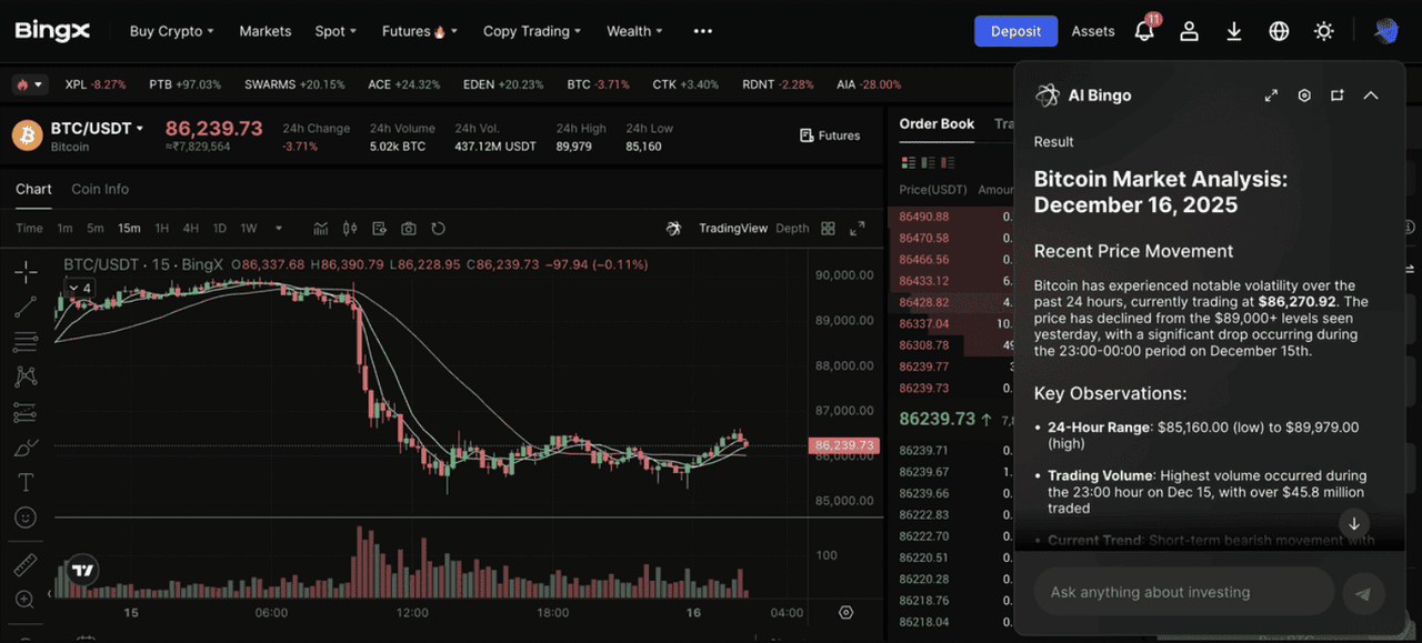 • BingX AI Chat: Engage in conversations, offering real-time strategy guidance and context-driven advice to help traders make informed decisions.