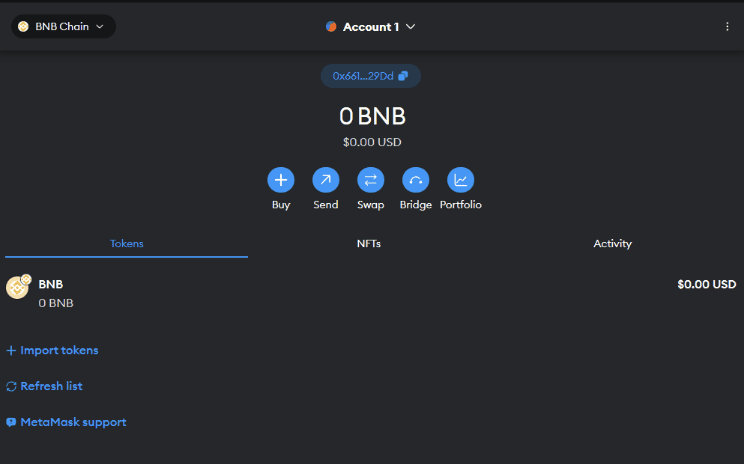 Tu nueva configuración de billetera está ahora completa y la dirección de cuenta de billetera existente ahora muestra el ícono BNB y el saldo BNB, indicando una integración exitosa. Ahora puedes comenzar a usar la red BSC en MetaMask para interactuar con dApps, intercambiar tokens y mucho más.