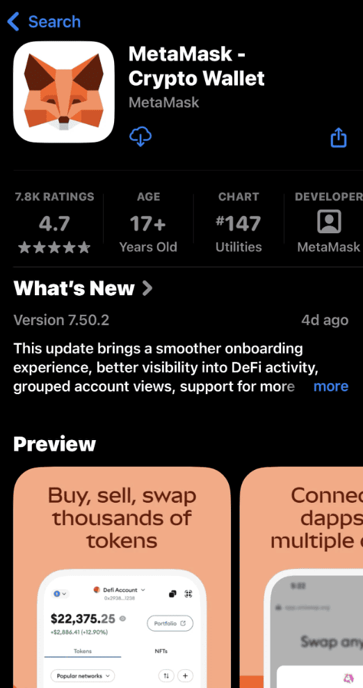 metamask.io), haz clic en "Descargar", luego selecciona tu navegador. Además de la extensión del navegador, las aplicaciones de Android e iOS de MetaMask también ofrecen una experiencia de usuario fluida de billetera cripto para comprar, almacenar y enviar activos cripto. Para usuarios de iOS, la aplicación móvil de MetaMask se puede descargar