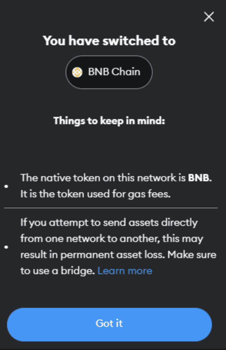 MetaMask ahora mostrará un mensaje de éxito para confirmar el cambio de red, pero aún hay algunas condiciones necesarias para usar Binance Smart Chain en MetaMask efectivamente. Por ejemplo, los usuarios necesitarán usar un puente para enviar activos digitales de una red a otra, y adicionalmente, los usuarios pueden necesitar agregar manualmente tokens BNB a la dirección de la billetera si no son visibles por defecto. Después de revisar estas "Cosas a tener en cuenta" mientras usas MetaMask con BNB Smart Chain, haz clic en 'Entendido' para completar el proceso de conexión.