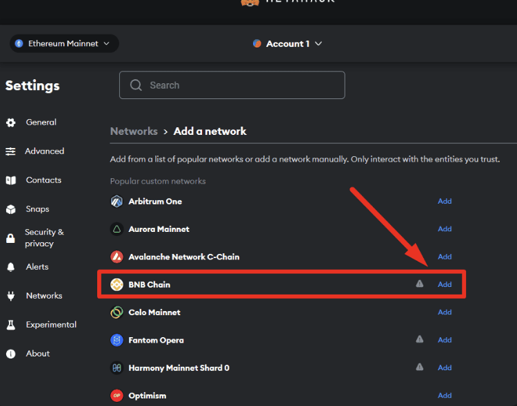 El paso anterior te llevará a una página de configuración de red con una lista de redes populares compatibles con MetaMask, donde puedes seleccionar BNB Smart Chain de la lista. Solo haz clic en el botón 'Agregar' junto a la opción BNB Smart Chain Mainnet para agregar la red automáticamente, aprovechando el soporte integrado de MetaMask para cadenas populares. Esta opción simplificada puebla todos los detalles necesarios sin entrada manual.
