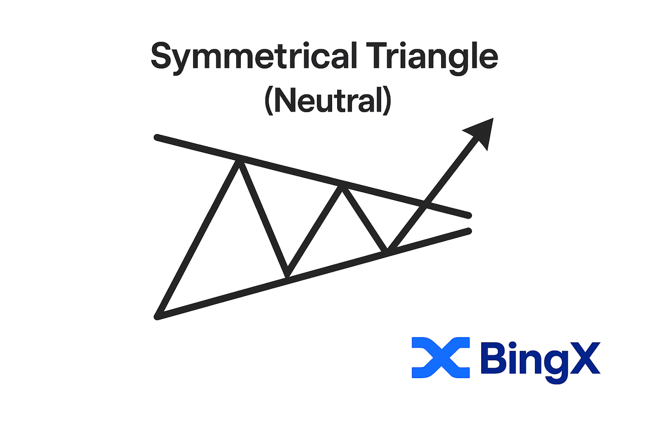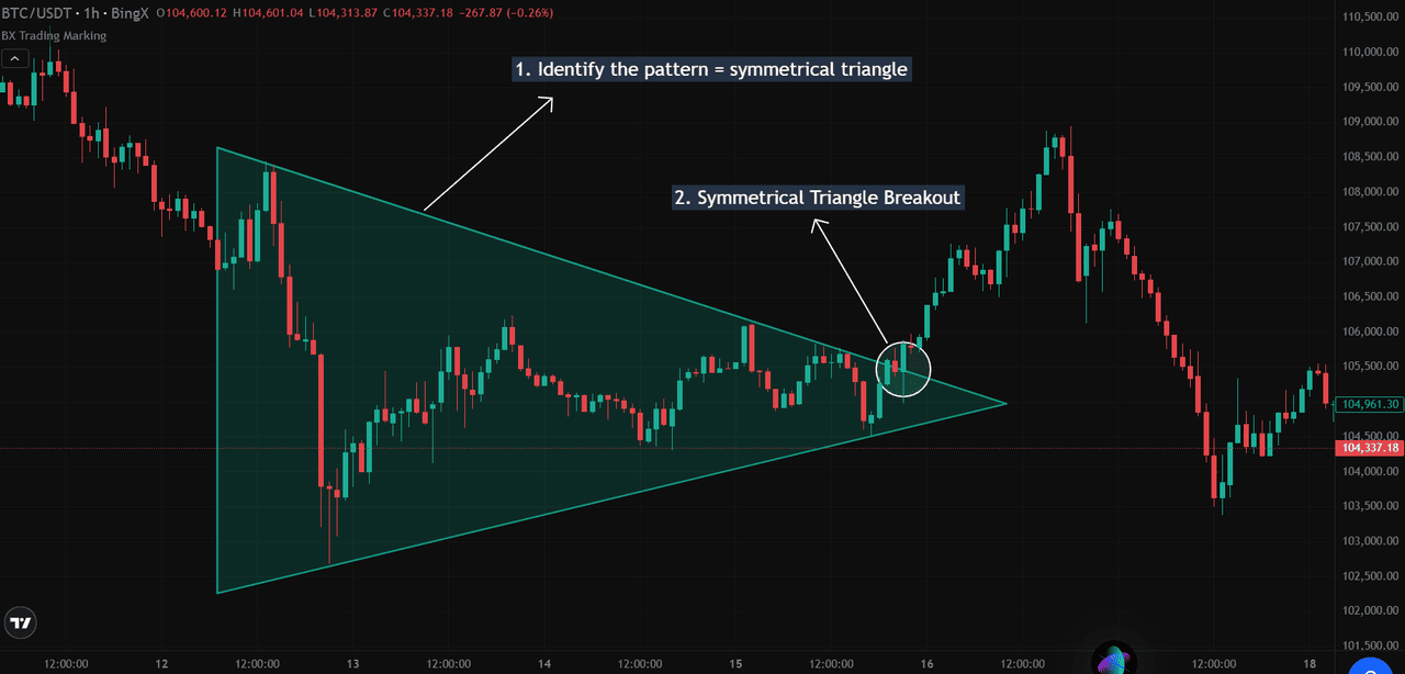 Desglosemos cómo usar un patrón de triángulo simétrico para proyectar objetivos de precio en el trading de criptomonedas, usando un gráfico real BTC/USDT de BingX en el marco temporal de 1 hora.