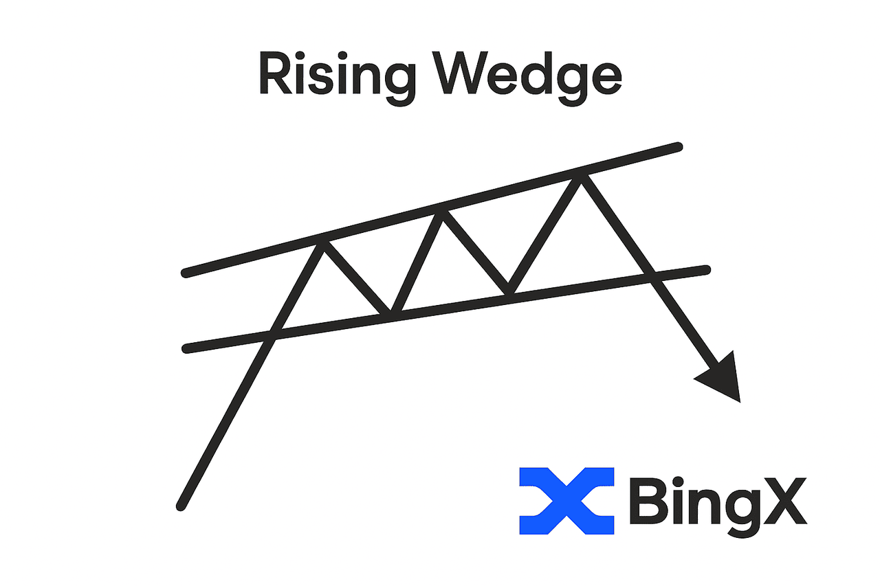 Un patrón de reversión bajista donde ambas líneas de tendencia de soporte y resistencia se inclinan hacia arriba, pero la línea de tendencia inferior sube más pronunciadamente, el precio está haciendo máximos más altos y mínimos más altos, pero el rango se está comprimiendo, señalando que el impulso comprador se está desvaneciendo.
