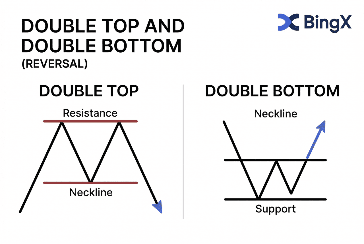 Un doble techo es un patrón de reversión bajista con forma de letra "M." El precio alcanza un nivel de resistencia dos veces pero no logra romper por encima, sugiriendo que la presión compradora se está agotando. El patrón se confirma cuando el precio cierra por debajo de la línea de cuello — el punto bajo entre los dos picos. El objetivo de precio se calcula midiendo la altura desde los techos hasta la línea de cuello y proyectando esa distancia hacia abajo desde la ruptura.