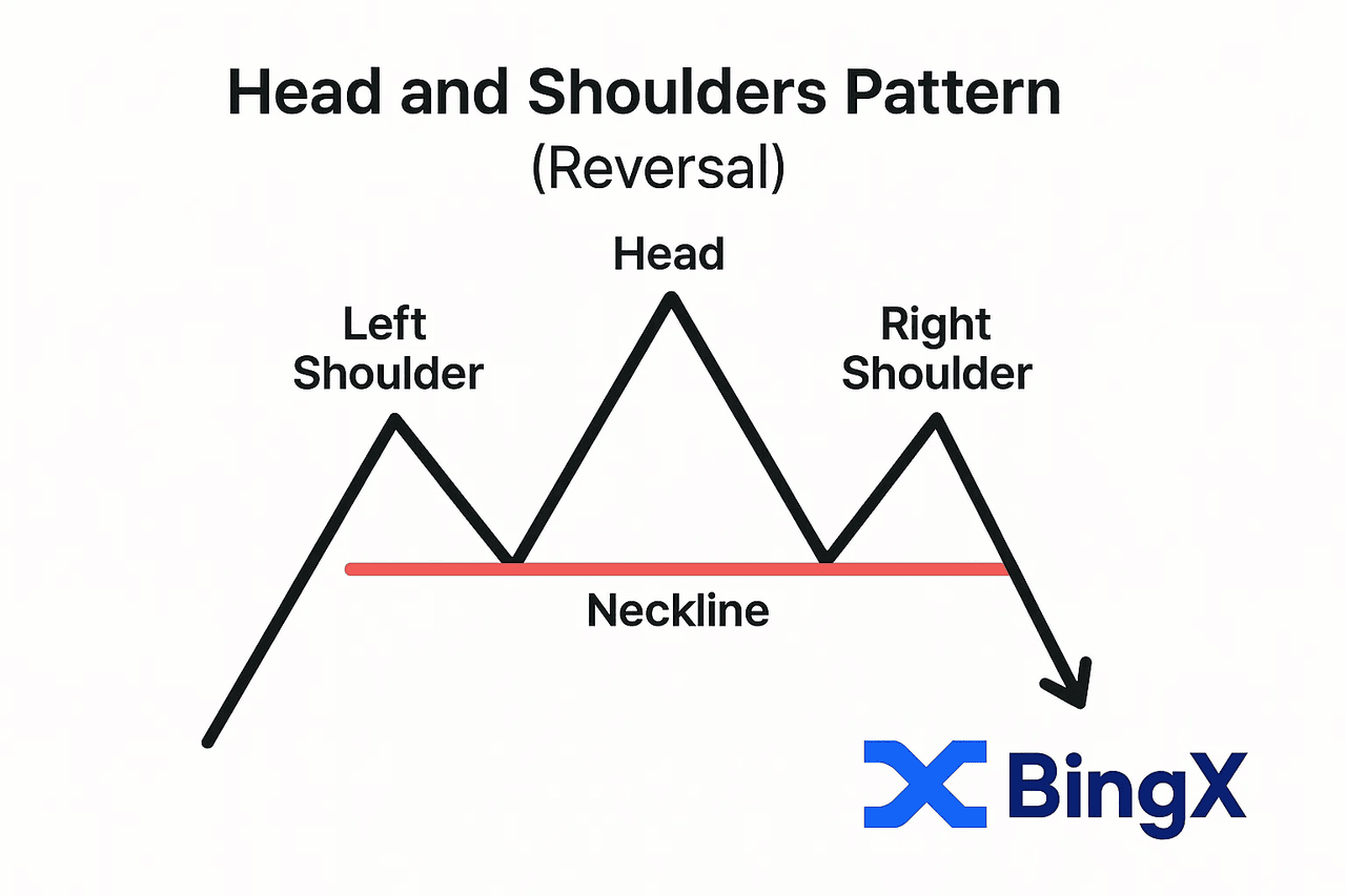 El cabeza y hombros es un patrón de reversión bajista de tres picos donde el pico del medio (la cabeza) es el más alto y los dos picos exteriores (los hombros) son más bajos y aproximadamente iguales en altura. Una línea de cuello horizontal conecta los mínimos entre cada pico. Cuando el precio rompe por debajo de la línea de cuello después de formar el hombro derecho, señala el fin de la tendencia alcista.