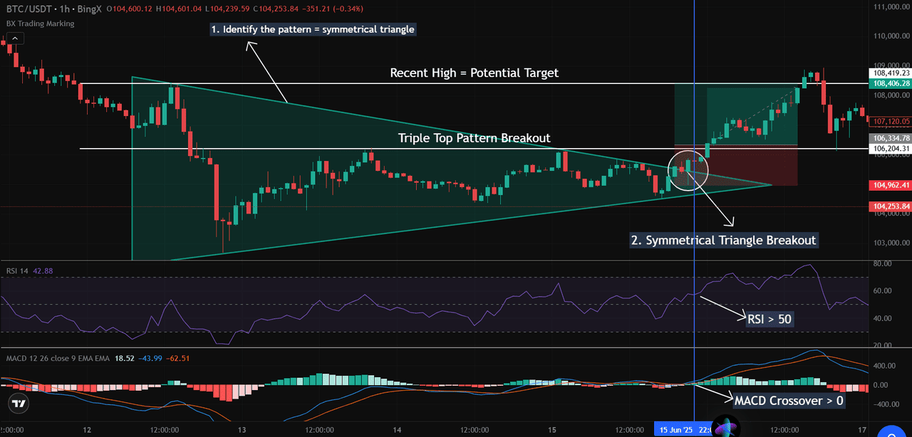 Los patrones de gráficos son herramientas valiosas en el trading de criptomonedas, pero funcionan mejor cuando se emparejan con confirmación, contexto y gestión de riesgos. A continuación hay una guía estructurada para aplicar patrones, como el triángulo simétrico en el gráfico BTC/USDT de 1 hora, de manera más efectiva en condiciones de mercado en vivo.