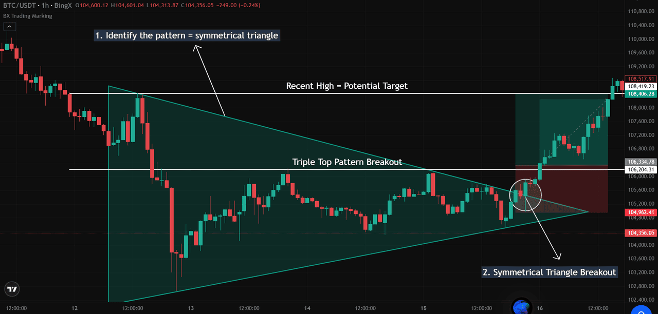 Eventualmente, BTC rompió por encima de la línea de tendencia superior alrededor de $105,800–$106,000, confirmando una ruptura alcista. Esto fue validado por un fuerte cierre de vela fuera del triángulo y un aumento en volumen, elementos clave que los traders buscan para confirmar que el movimiento es genuino. En este punto, el triángulo se transforma de un patrón neutral en una configuración de continuación alcista.