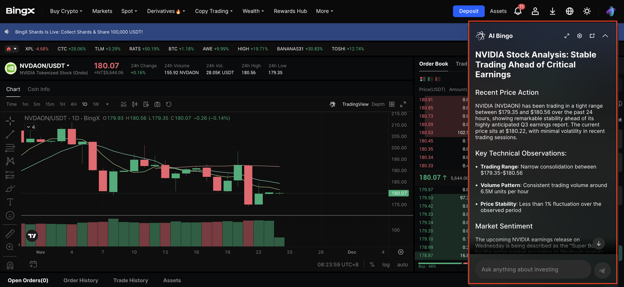 En el mercado Spot de BingX, los usuarios pueden operar acciones tokenizadas de IA a través de pares como NVDAON/USDT, METAX/USDT, GOOGLON/USDT, MSFTON/USDT o AAPLX/USDT. Estos tokens basados en blockchain están diseñados para seguir el precio de mercado de sus acciones de IA subyacentes y permiten a los usuarios mantener el activo tokenizado directamente, sin apalancamiento.