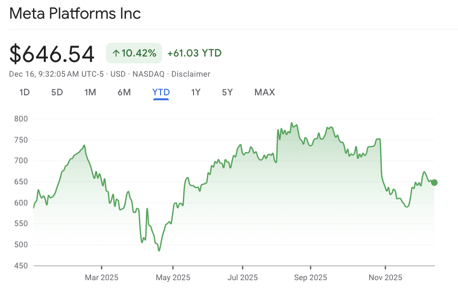 La estrategia de IA de Meta en 2025 se centró en la optimización de la publicidad impulsada por IA, los sistemas de recomendación y el despliegue de modelos a gran escala en sus plataformas principales. La IA desempeñó un papel central en la mejora de la clasificación de contenido y la segmentación de anuncios en Facebook e Instagram, apoyando directamente el compromiso y la eficiencia de los ingresos. Meta también continuó avanzando en su familia de modelos Llama de código abierto, reforzando su posición en la investigación fundamental de IA mientras monetizaba la IA principalmente a través de la publicidad. Las acciones de Meta experimentaron una volatilidad notable durante el año, cayendo por debajo de los $500 en primavera antes de recuperarse. A mediados de diciembre de 2025, las acciones cotizaban alrededor de $647, generando aproximadamente un +10.5% de rendimiento en lo que va del año, respaldadas por la mejora del margen, controles de costos disciplinados y confianza en el modelo publicitario impulsado por IA de Meta.