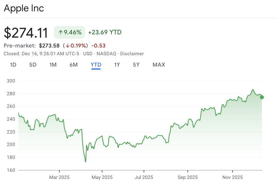 La estrategia de IA de Apple en 2025 enfatizó la inteligencia en el dispositivo, el diseño centrado en la privacidad y la profunda integración del ecosistema en lugar de una marca de IA independiente. Las capacidades de IA se integraron cada vez más en iOS, macOS y Apple Silicon, impulsando funciones como interacciones mejoradas de Siri, procesamiento de imágenes y video, e inteligencia personalizada a nivel de sistema. Las acciones de Apple (AAPL) experimentaron volatilidad en la primera mitad del año, cayendo brevemente por debajo de los $180 en primavera antes de iniciar una recuperación constante. A mediados de diciembre de 2025, las acciones de Apple cotizaban alrededor de $274, generando aproximadamente un +9.5% de rendimiento en lo que va del año, respaldadas por el crecimiento de los servicios, los ciclos de actualización de hardware y la creciente confianza de los inversores en la hoja de ruta de IA a largo plazo de Apple.