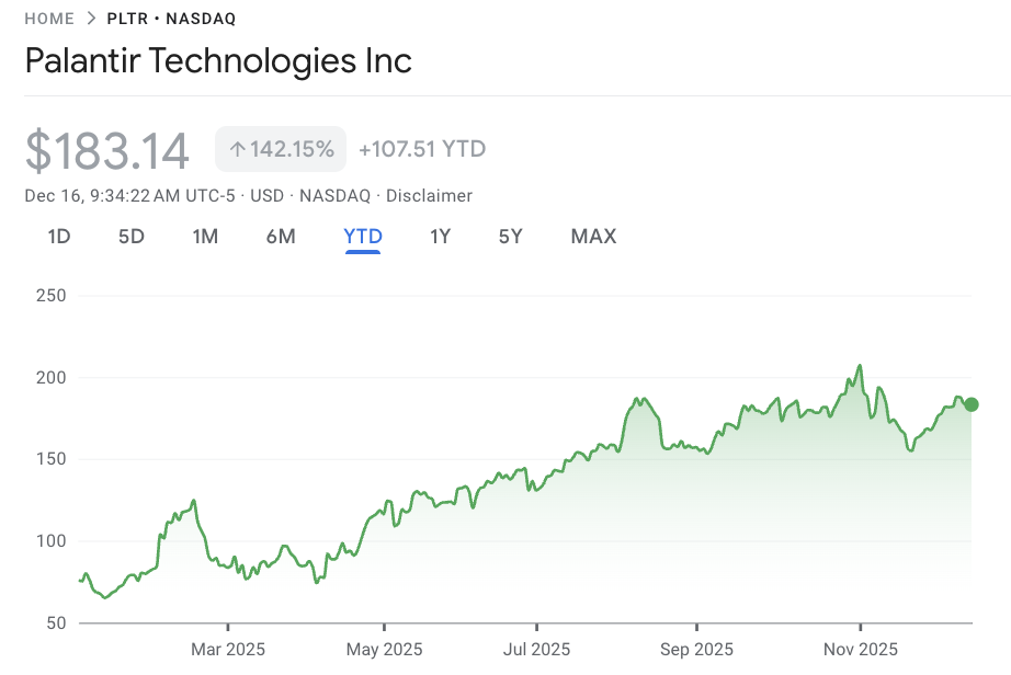Palantir (PLTR) fue una de las acciones relacionadas con la IA con mejor rendimiento en 2025, impulsada por la creciente adopción de su Plataforma de Inteligencia Artificial (AIP) entre clientes gubernamentales y empresariales. La empresa se centró en casos de uso de IA operativa, como la integración de datos, el soporte de decisiones y los flujos de trabajo de misión crítica, en lugar de productos orientados al consumidor. Las acciones de Palantir mostraron un fuerte impulso durante todo el año, subiendo constantemente después de la primavera y manteniendo niveles elevados hasta fin de año. A mediados de diciembre de 2025, las acciones cotizaban alrededor de $183, generando aproximadamente un +142% de rendimiento en lo que va del año, lo que refleja la confianza de los inversores en la capacidad de Palantir para traducir los despliegues de IA en ingresos a largo plazo basados en contratos.