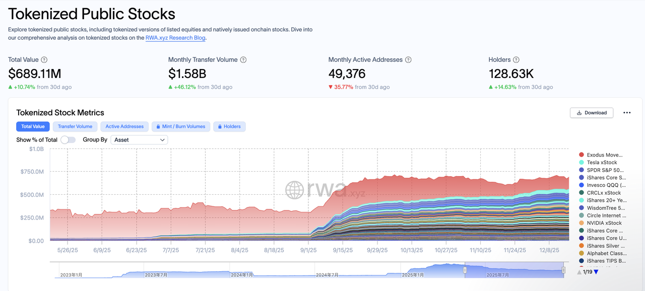 A finales de 2025, el mercado de acciones tokenizadas aún estaba en sus primeras etapas, pero crecía rápidamente. Alrededor de 660 millones de dólares en acciones públicas estaban en cadena como acciones tokenizadas, generando más de 1.22 mil millones de dólares en volumen de transferencia mensual y siendo mantenidas por casi 119,000 billeteras. Al mismo tiempo, el mercado más amplio de tokenización de activos del mundo real (RWA), que incluye acciones, bonos gubernamentales y crédito privado, superó los 30 mil millones de dólares en valor total. Las estimaciones de la industria sugieren que si incluso el 1% de las acciones globales se tokenizan, el mercado podría superar los 1.3 billones de dólares para 2030, lo que destaca el potencial a largo plazo de este modelo.