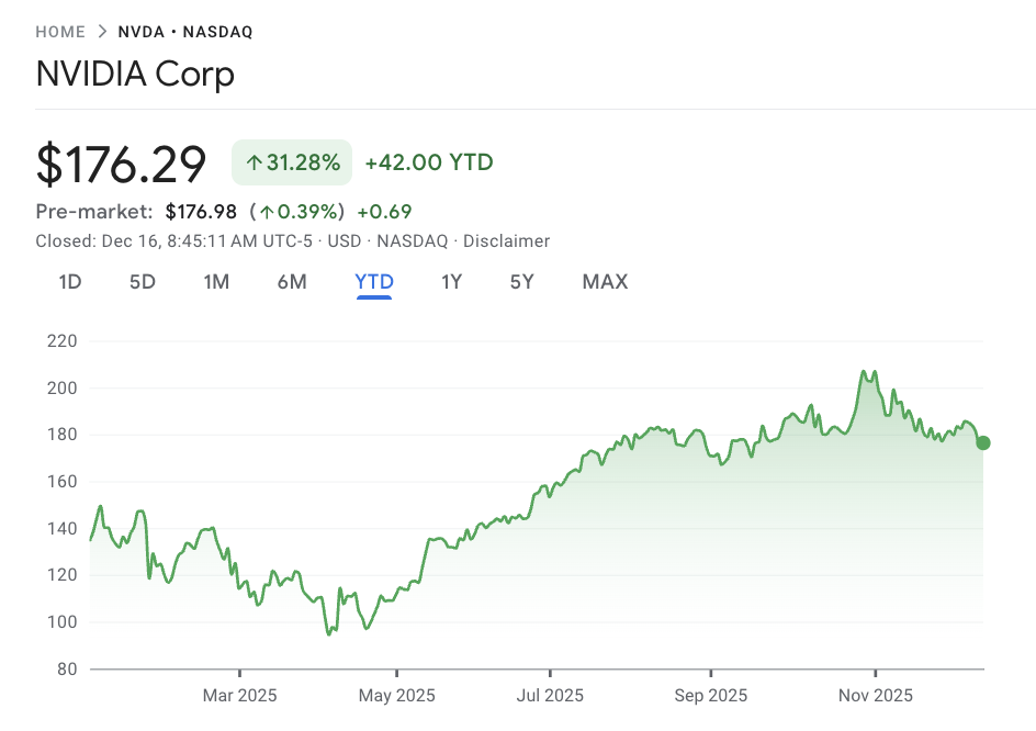 Nvidia (NVDA) fue la acción de IA que definió 2025. En junio de 2025, Nvidia se convirtió en la primera empresa que cotiza en bolsa en la historia en superar una capitalización de mercado de 5 billones de dólares en su punto máximo, lo que subraya su papel central en la construcción de la infraestructura global de IA. La demanda de sus GPU y plataformas de computación acelerada continuó aumentando en proveedores de nube a hiperescala, implementaciones de IA empresarial y proyectos de centros de datos respaldados por el gobierno. Desde principios de 2025 hasta mediados de diciembre, las acciones de Nvidia generaron aproximadamente un +31% de rendimiento en lo que va del año, subiendo desde el rango bajo de $130 a principios de año para cotizar alrededor de $176 a mediados de diciembre. A pesar de los períodos de volatilidad, Nvidia siguió siendo uno de los contribuyentes de gran capitalización más fuertes al rendimiento general del sector tecnológico a medida que el gasto de capital en IA pasó decisivamente de la experimentación al despliegue a largo plazo.