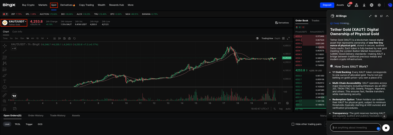 Paire de trading XAUT/USDT sur le marché spot alimentée par Bingx AI