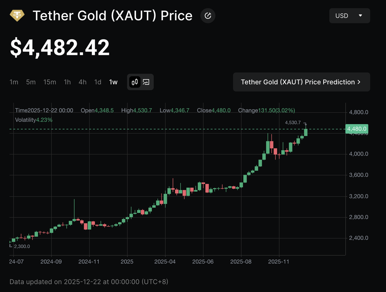Tether Gold (XAUt) est un actif aurifère tokenisé qui représente la propriété d'or physique stocké dans des coffres professionnels, permettant aux investisseurs d'obtenir une exposition à l'or avec une liquidité 24h/24 et 7j/7 et un règlement basé sur la blockchain. Alors que la demande d'or numérique augmente, la capitalisation boursière totale des actifs aurifères tokenisés a atteint environ 4,5 milliards de dollars. Dans cette catégorie, XAUT reste le produit leader, représentant environ la moitié de la valeur marchande totale du secteur tout en suivant de près les prix de l'or au comptant.