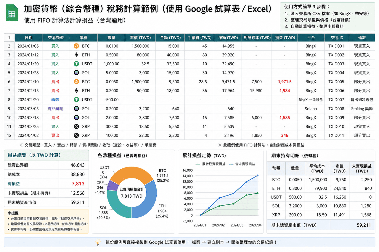 - Excel/Google Spreadsheet: Tidak bergantung pada alat pihak ketiga, dapat langsung mengimpor CSV exchange, membangun field dan logika perhitungan sendiri, sepenuhnya sesuai dengan kebutuhan pelaporan Taiwan untuk mengatur data. Cocok untuk pengguna dengan jumlah transaksi tidak banyak atau ingin menguasai proses perhitungan lengkap, memiliki keunggulan dalam kontrol format dan fleksibilitas.