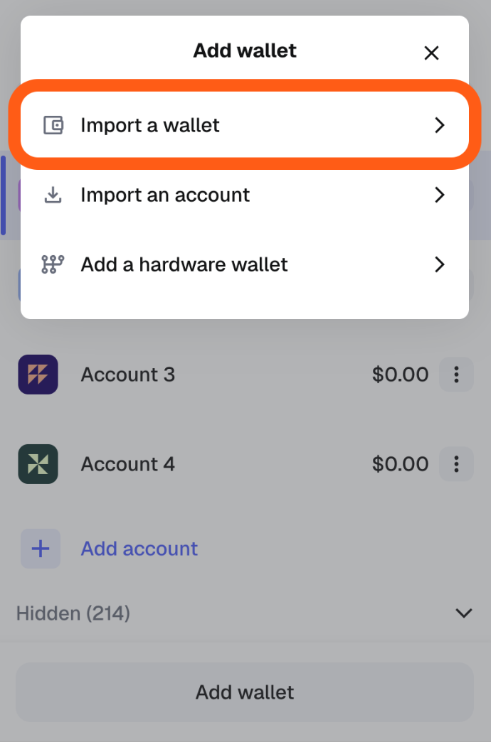 — アカウントのドロップダウンをクリックし、「ウォレットを追加」を選択します。