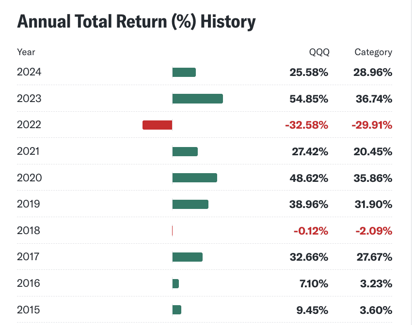 Historia rocznych zwrotów Invesco QQQ | Źródło: Yahoo Finance