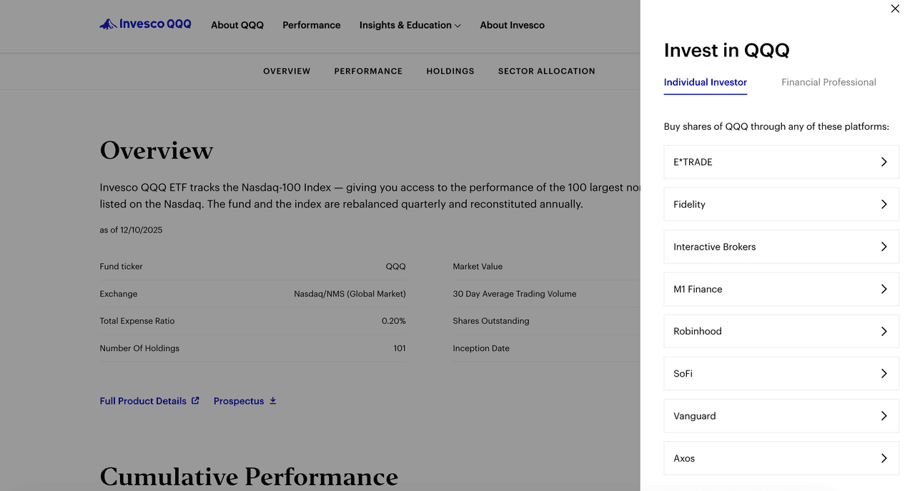 Najczęstszym sposobem inwestowania w QQQ jest tradycyjne konto maklerskie. QQQ jest jednym z funduszy ETF o największym wolumenie na świecie i ściśle odzwierciedla indeks Nasdaq-100. Oferuje ekspozycję na wiodące firmy technologiczne, półprzewodnikowe, AI i innowacyjne w dziedzinie konsumpcji, takie jak Apple, Microsoft, Nvidia, Amazon, Alphabet i Meta. Ta metoda jest idealna dla długoterminowych inwestorów, którzy chcą regulowanego dostępu i znajomego doświadczenia handlowego.