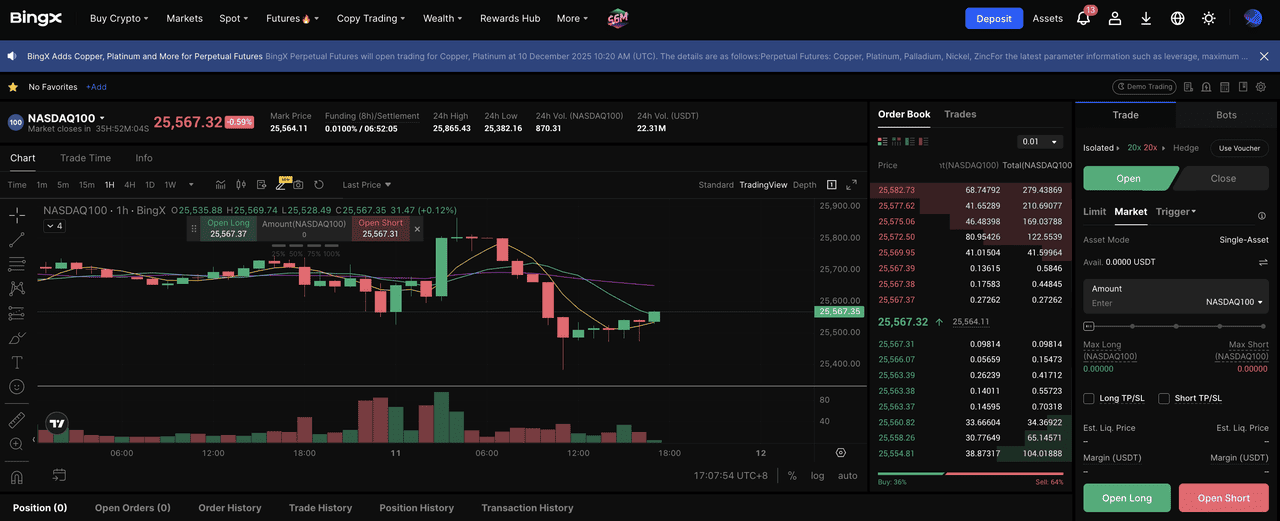 Jeśli chcesz większej elastyczności niż inwestowanie spot, możesz handlować wieczystymi kontraktami futures na Nasdaq 100 na platformach takich jak BingX. Kontrakty te śledzą wyniki indeksu Nasdaq 100, dając Ci ekspozycję na ten sam rynek, który reprezentuje QQQ, ale za pośrednictwem produktu futures zamiast tokenizowanego ETF. Nie jest to to samo, co handel QQQON. Kontrakty futures pozwalają na zajmowanie pozycji długich lub krótkich, stosowanie dźwigni finansowej i zabezpieczanie istniejących pozycji akcyjnych lub kryptowalutowych przez całą dobę.