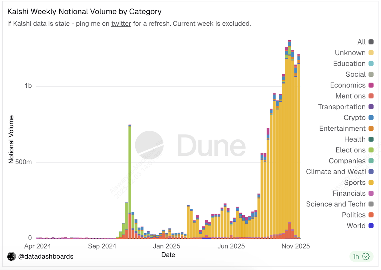 Volume nocional semanal da Kalshi por categoria | Fonte: Dune Analytics