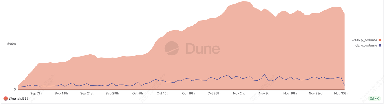 Volume diário e semanal da Polymarket | Fonte: Dune Analytics