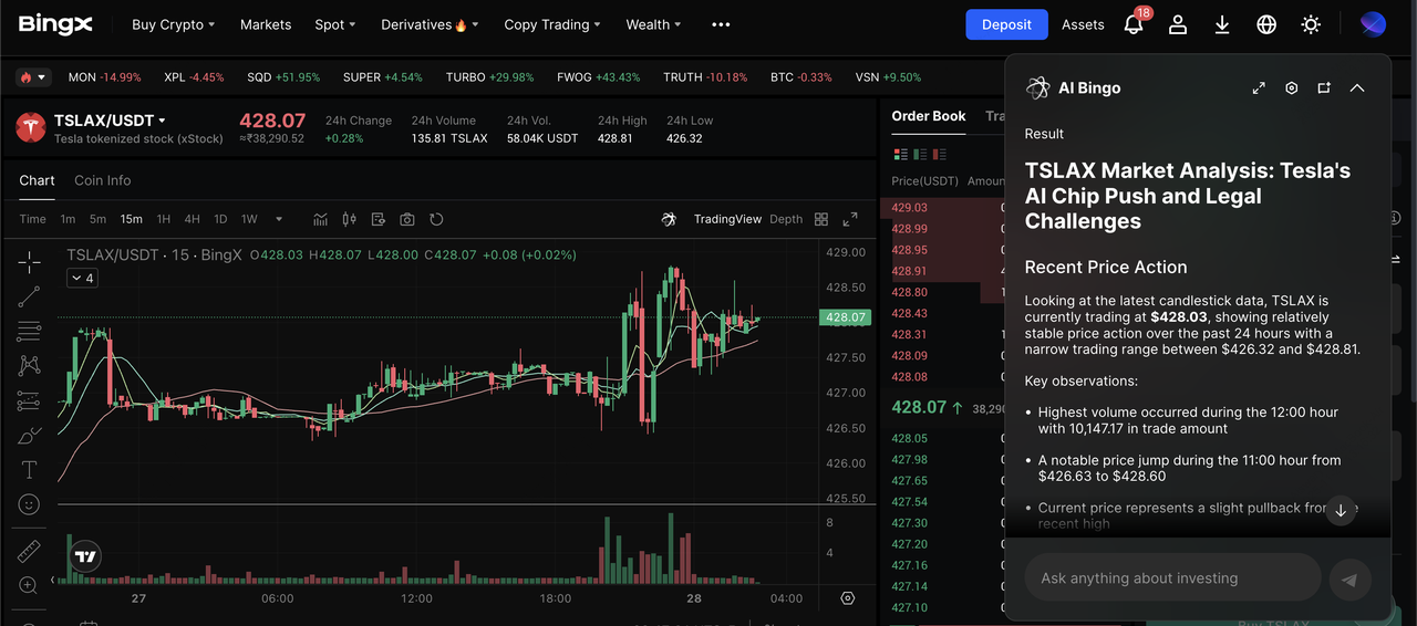 Perechea de tranzacționare TSLAX/USDT pe piața spot, susținută de informațiile AI BingX