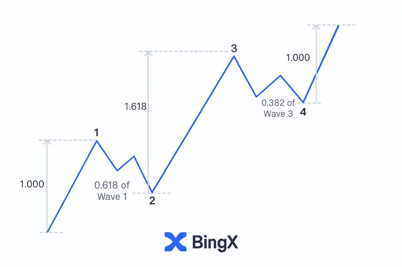 De exemplu, Unda 2 se retrage adesea în jurul valorii de 0,618, Unda 3 atinge în mod obișnuit extensia de 1,618, iar Unda 4 tinde să fie superficială, retrăgându-se aproape de nivelul 0,382. Când Unda 3 este cea mai lungă, Undele 1 și 5 se oglindesc de obicei în lungime.