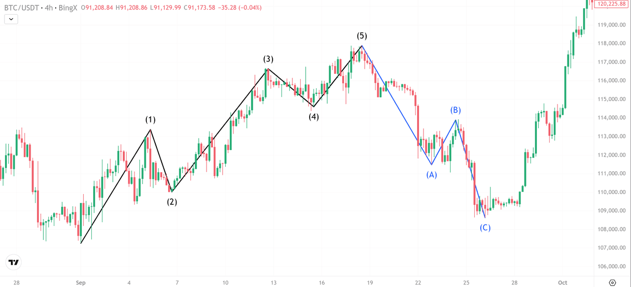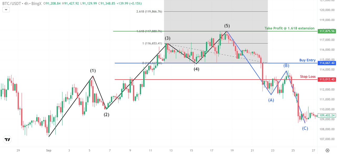 Unda (4) formează de obicei o structură corectivă ușoară înainte de ultima împingere în Unda (5). BTC/USDT a scăzut în retragerea 0,236–0,382 a Undei (3), consolidându-se în jurul valorii de 114.667 USD.