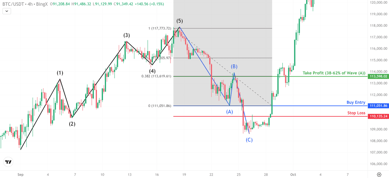 Traderii pe termen scurt pot tranzacționa și revenirea corectivă. Unda (A) a format suport în apropiere de 111.051 USD, creând un minim de epuizare intraday. O intrare lungă aici vizează retragerea tipică de 38–62% a Undei (A), care s-a aliniat cu 113.598 USD. Stop-loss-urile sunt plasate sub minimul Undei (A) la 110.135 USD pentru a menține riscul controlat.