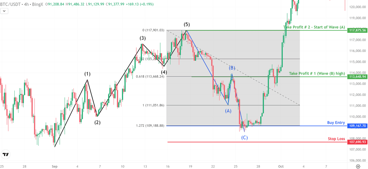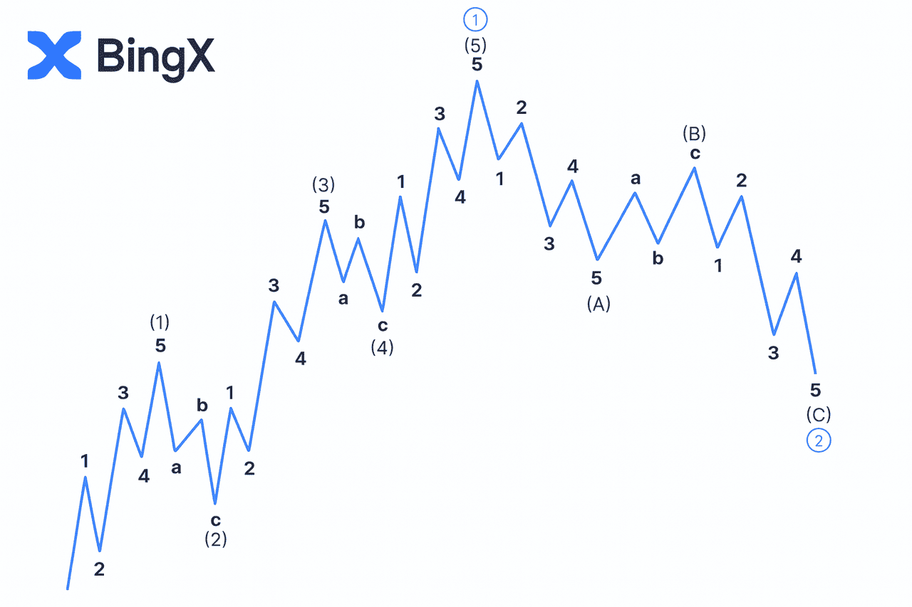 BTC/USDT prezintă o fază motivă completă de cinci unde, urmată de o corecție A–B–C, creând oportunități clare de tranzacționare atât pentru strategiile de urmărire a tendinței, cât și pentru cele de inversare. Mai jos sunt configurațiile pe care traderii le-ar fi putut executa folosind regulile standard ale Undelor Elliott.