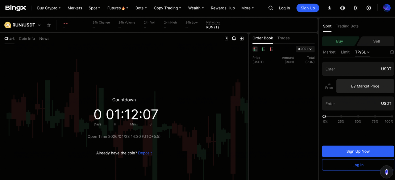 หลังจากการจดทะเบียนเมื่อ 23 เมษายน 2026 $RUN สามารถซื้อขายสปอตบน BingX เพื่อให้ได้เปรียบในการแข่งขัน นักเทรดสามารถใช้ BingX AI เพื่อวิเคราะห์ความเชื่อมั่นของตลาดแบบเรียลไทม์ ระบุรูปแบบทางเทคนิค และทำให้กลยุทธ์การซื้อขายกริดเป็นแบบอัตโนมัติ ช่วยในการนำทางช่วงเปิดตัวที่มีความผันผวนสูงของโทเค็น $RUN