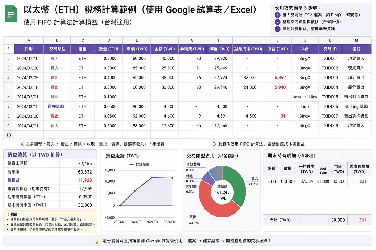 - การซื้อขาย ETH สปอต:สถานการณ์ที่พบบ่อยที่สุดคือซื้อ ETH แล้วขายเมื่อราคาขึ้นเพื่อทำกำไรและถอนเข้าบัญชีธนาคาร กำไรประเภทนี้เป็นรายได้จากการจำหน่ายทรัพย์สิน ตัดสินเป็นรายได้ในประเทศหรือต่างประเทศตามช่องทางถอนเงิน วิธีการคำนวณคือ "ยอดขาย − ต้นทุนซื้อ − ค่าธรรมเนียมการซื้อขาย" รายได้รวมในการแสดงรายการภาษีเงินได้บุคคลธรรมดาหรือรายได้ขั้นต่ำของปีนั้น แนะนำให้ดาวน์โหลดบันทึกการซื้อขายและสำรองข้อมูลทันทีหลังการซื้อหรือขายแต่ละครั้ง เป็นพื้นฐานการคำนวณในภายหลัง หากเป็นการเข้าแบบแบ่งงวด ETH ชุดเดียวกันสามารถใช้ FIFO หรือวิธีต้นทุนเฉลี่ย แต่ปีเดียวกันควรใช้แบบเดียวกัน