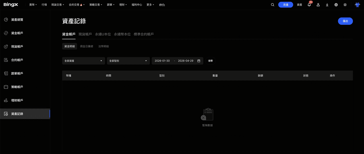 - เข้าสู่ระบบบัญชี BingX และเข้าสู่หน้าบันทึกการซื้อขาย:หลังจากเข้าสู่ระบบ BingX ไปที่หน้า "สินทรัพย์" หรือ "คำสั่งซื้อ" สามารถดูประวัติการซื้อขายที่สมบูรณ์ของบัญชีส่วนบุคคล การซื้อขายที่เกี่ยวข้องกับ ETH รวมการซื้อขายสปอต ETH/USDT การถือครองสัญญาถาวร และบันทึกอัตราค่าใช้จ่ายเงินทุน