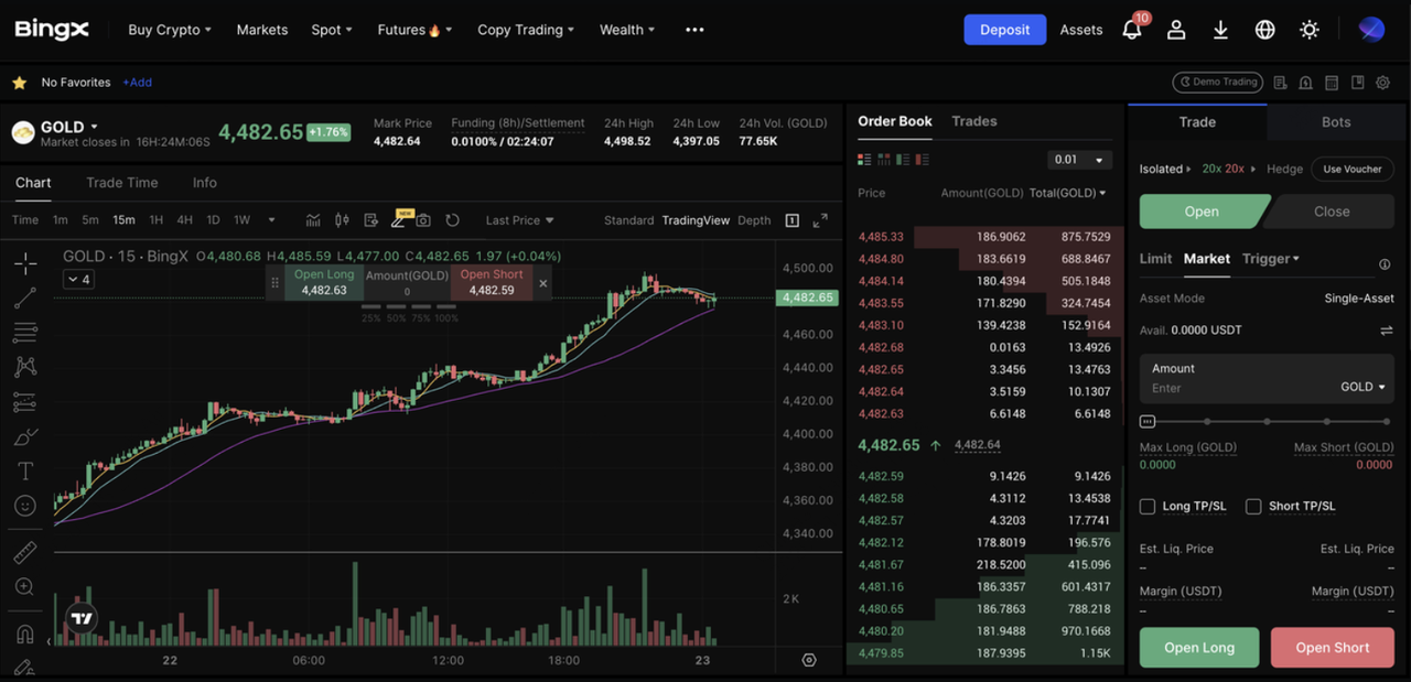 Khởi tạo giao dịch hợp đồng trên BingX rất đơn giản và thân thiện với người dùng, được thiết kế để đưa các nhà giao dịch vào thị trường một cách nhanh chóng và an toàn. Ví dụ, giao dịch hợp đồng vàng trên BingX cho phép bạn có được sự tiếp xúc trực tiếp với biến động giá vàng bằng cách sử dụng tài sản thế chấp crypto, kết hợp độ sâu của thị trường vàng truyền thống với tốc độ, đòn bẩy và kiểm soát rủi ro của nền tảng hợp đồng crypto hiện đại.