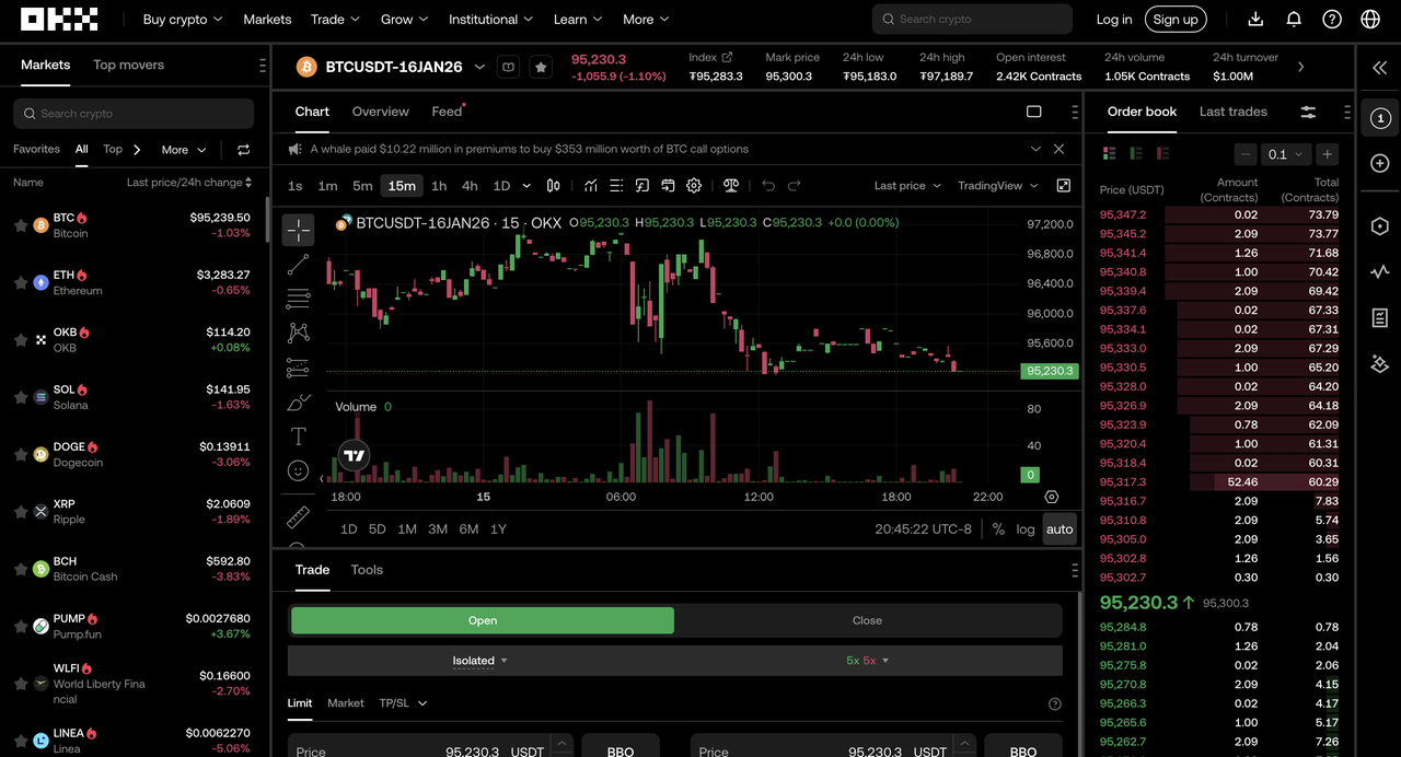 BTC USDT), phí thấp bắt đầu từ 0,02% maker và 0,05% taker, và các tính năng như chế độ ký quỹ chéo riêng, các loại lệnh nâng cao bao gồm iceberg và TWAP, cũng như các công cụ quản lý rủi ro mạnh mẽ. OKX thu hút các nhà giao dịch chuyên nghiệp và tổ chức với khả năng thực hiện hiệu suất cao, bằng chứng dự trữ minh bạch được cập nhật hàng quý và phạm vi tiếp cận toàn cầu loại trừ một số khu vực bị hạn chế nhất định, xử lý lãi suất mở trung bình hàng ngày hơn 15 tỷ USD trong các hợp đồng chính.